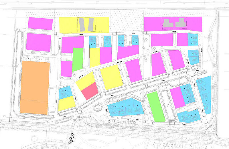 Onderaan over de breedte loopt de Koestraat. Uitleg kleuren: De verdeling is als volgt: Geel: Sociale huur, roze: Midden huur, paars: Projectontwikkelaar, fel groen: CPO, blauw: vrije kavels, oranje: schoollocatie, groen: buiten beschouwing voor loting.