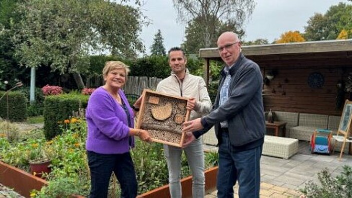 Met haar creatieve aanpak won Liesbeth een prachtig bijenhotel, dat de komende jaren zal zorgen voor nog meer leven en biodiversiteit in haar tuin. Het bijenhotel werd uitgereikt door Roy Heymans, projectuitvoerder Groen bij de gemeente Asten, en Ad Verhoeven, voorzitter van de Agrarische Natuurvereniging.