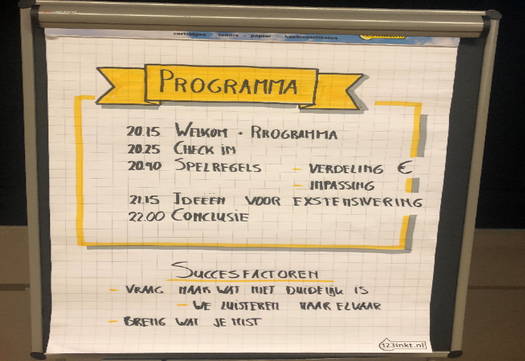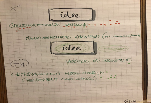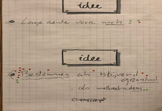 Nadat iedere deelnemer deze vraag individueel heeft beantwoord zijn ze verzameld en geclusterd. Hierna kon doormiddel van stickers gestemd worden voor de meest en minst gedragen ideeën.