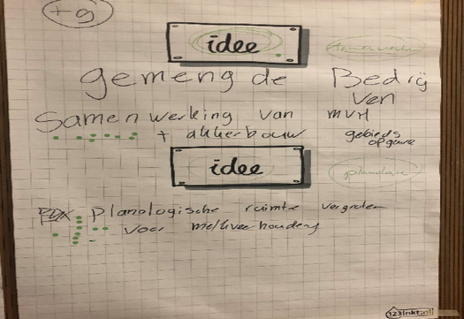 Dit idee is gedurende de avond een aantal keren genoemd. Door de gemeente wordt benoemd dat mestvergisting in het vigerend bestemmingsplan reeds mogelijk is gemaakt. - Samenwerking tussen melkveehouderij en akkerbouw vergroten